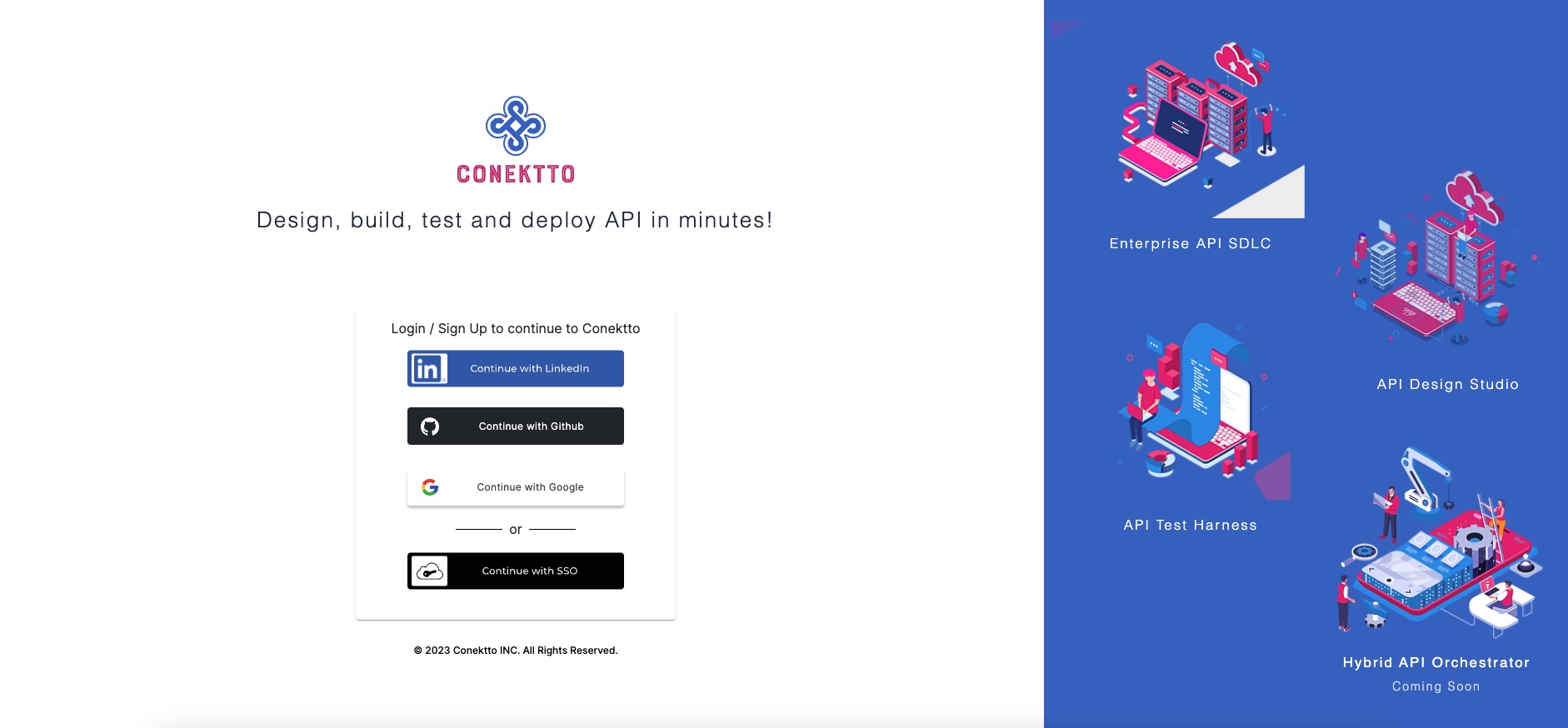 You may use [LinkedIn](https://www.linkedin.com), [GitHub](https://www.github.com) or [Google](https://myaccount.google.com) credentials to login to [app.conektto.io](https://app.conektto.io/signin/). Conektto's enterprise users contact your IT Admin for secure single sign-on access.